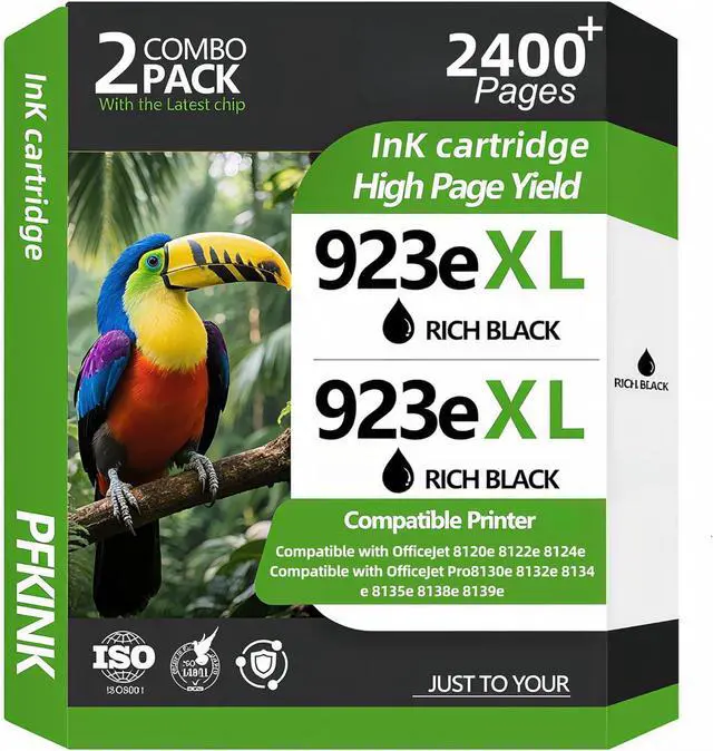 • The packaging includes: PFKink cartridges (923e ,2-Pack set) replacement for HP 923e black ink cartridge.