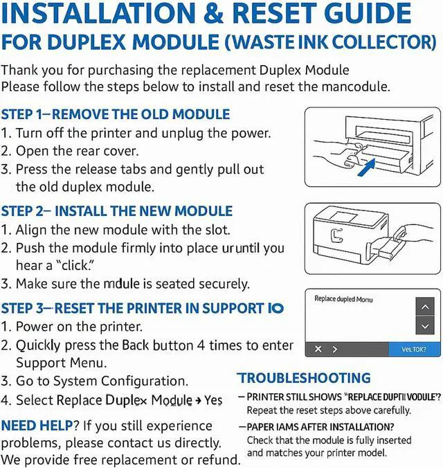 When your printer displays a Service Ink Container is Full , replace the duplex Modular assembly immediately. Order the compatible replacement part, power off the printer, remove the old unit, insert the new unit securely, The whole process took about 2-3 minutes. Be sure to watch the YouTube video about how to reset the printer menu after you insert the new unit