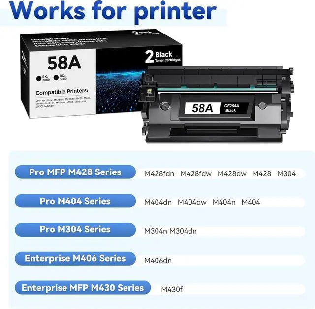 Package Contents: 2 Packs CF258A 58A toner cartridge replacement for cf258A 58A 58x cf258x high yield toner cartridge black