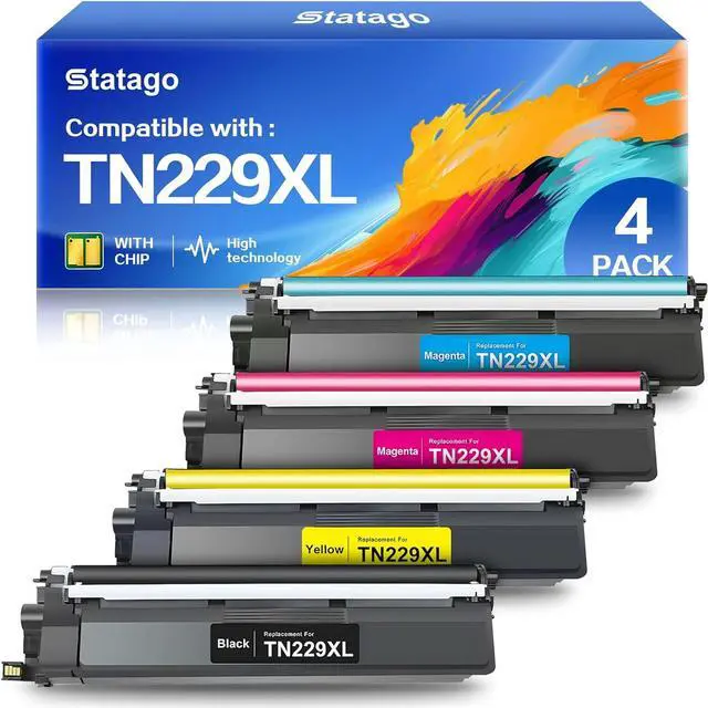 Package Contents: 4 Pack TN229XL toner cartridge for Brother 229XL TN229 XL toner cartridge, Including 1 x Black TN229XL toner, 1 x Cyan TN229XL toner, 1 x Magenta TN229XL toner, 1 x Yellow TN229XL toner.