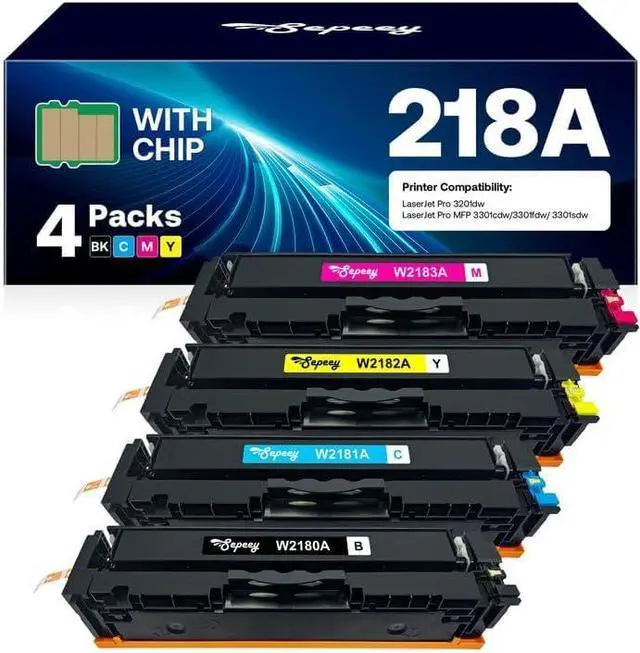 Package Contents: Replacement for hp 218a toner cartridges 4 pack with chip, 1x 218A black, 1x 218A Cyan, 1x 218A Yellow, 1x 218A Magenta.