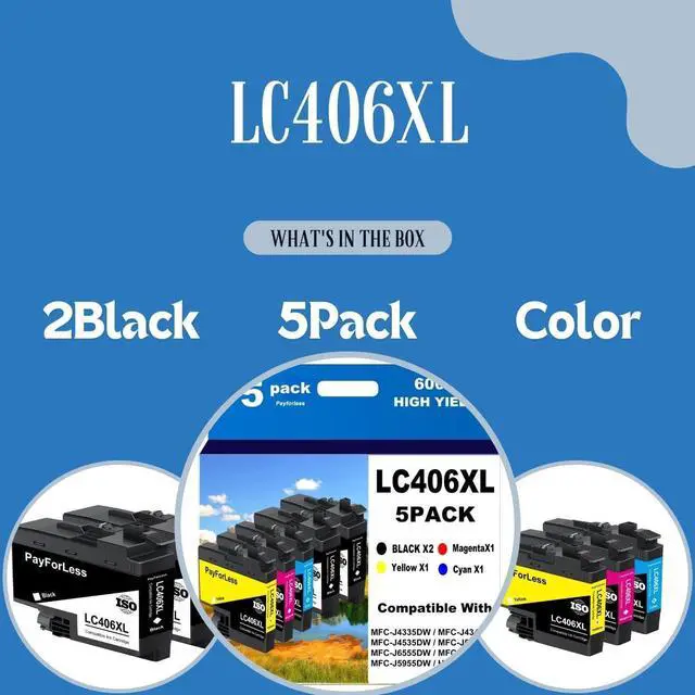 Package Contains: 5 Pack LC406XL ink cartridges. 2 X LC406XL Black, 1 X LC406XL Cyan, 1 X LC406XL Magenta, 1 X LC406XL Yellow.