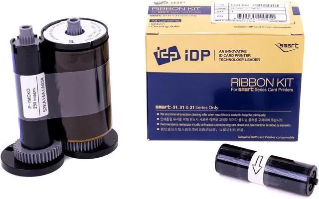 Whats Included: The kit includes Genuine IDP SMART YMCKO full-color, resin black, and overlay panel ribbon with a cleaning roller that prints up to 250 glossy PVC cards, which are included in the bundle.
