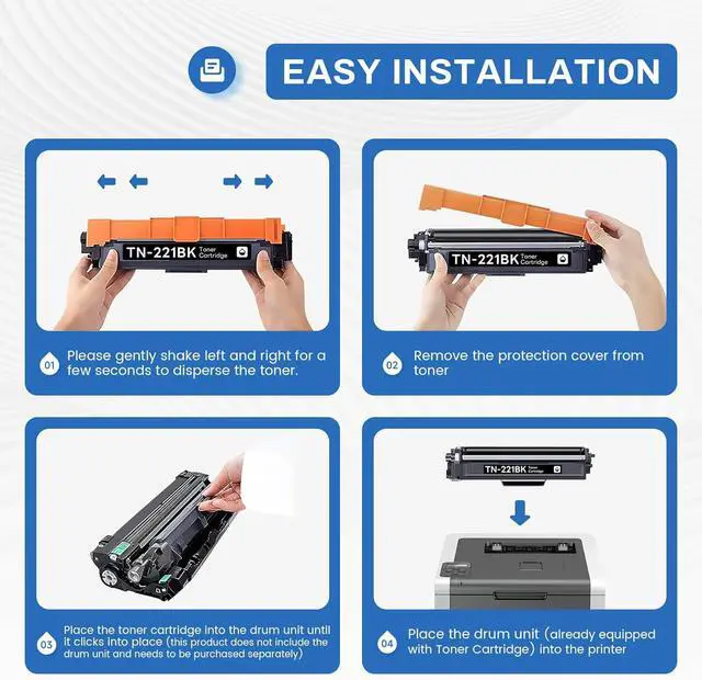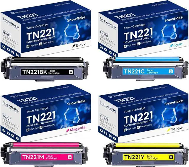 The package contains : 4 Pack TN221 TN-221 Toner Cartridges (1Black+1Cyan+1Magenta+1Yellow).