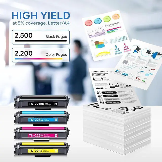 Page yield : Up to 2,500 pages per Black & 2,200 pages per Color Toner Cartridge (at 5% coverage, Letter/A4).