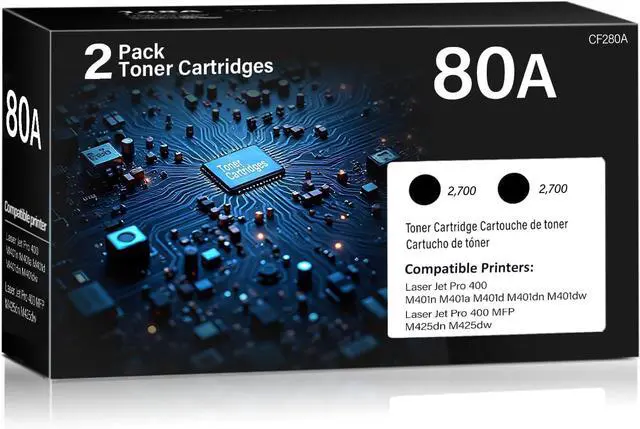 Package Included: 80A CF280A toner cartridges 2 pack compatible for HP 80A toner cartridges contains 2 x 80A Black toner(CF280A), Replacement for 80A 80X CF280A CF280X toner for HP Laser jet Pro 400 M401n M401a M401d M401dn M401dw, Laser Jet Pro MFP 400 M425dn M425dw printer