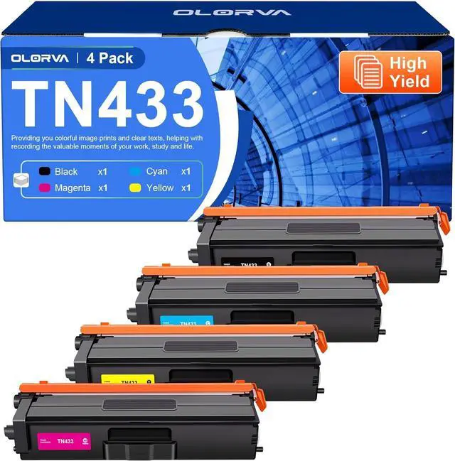 2. What's in the Box: tn-433 toner cartridges 4 pack includes 1 x TN433 bk Black Toner Cartridge, 1 x TN433C Cyan, 1 x TN 433M Magenta, 1 x TN 433 Yellow, high yield replacment for Brother TN433 toner cartridge set