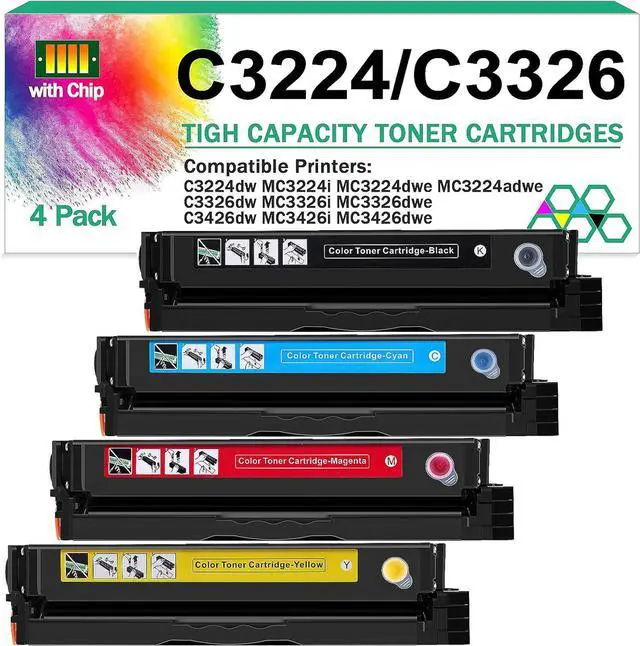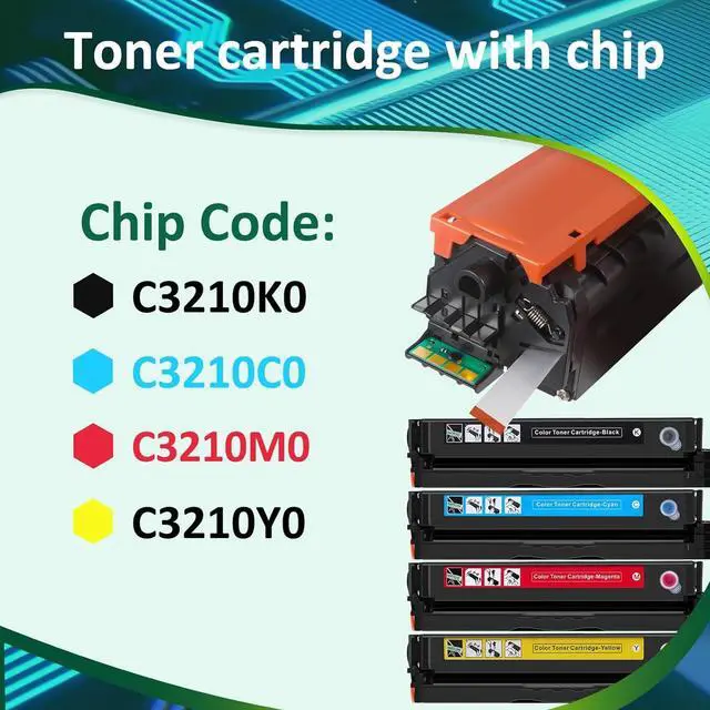 Packing list:1 Pack C3210K0 black toner cartridge,1 pack C3210C0 cyan toner cartridge,1 pack C3210M0 magenta toner cartridge,1 pack C3210Y0 yellow toner cartridge.