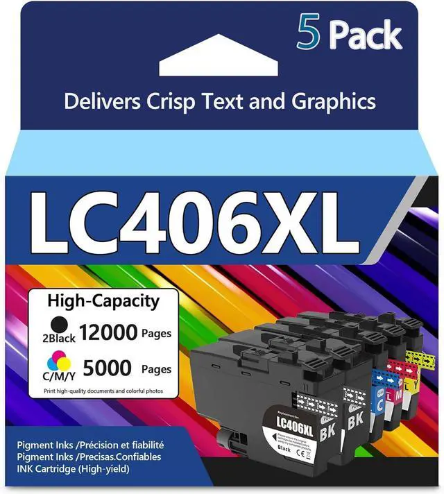 PACKAGE CONTENTS: 5-pack ink cartridge set includes 2 Black cartridges plus 1 each of Cyan, Magenta, and Yellow cartridges in the LC406XL series