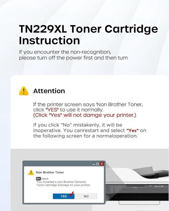 Page Yield: Up to 3,000 pages for TN229XL black toner cartridge-TN229XLBK, Up to 2,300 pages for TN229XL color toner cartridges-TN229XLC/M/Y (Letter/A4, at 5% coverage)