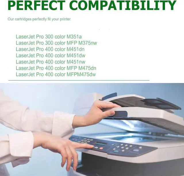 This cartridge works with: Compatible for HP Pro 300 color M351a; Pro 300 color MFP M375nw; Pro 400 color M451dn, M451dw, M451nw; Pro 400 color MFP M475dn, M475dw