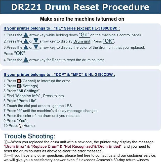 Notice: Since you replaced the drum unit with a new one, the printer may display the message "Drum Error" & "Replace Drum" & "Not Recognized", and you need to reset the drum counter to clear the error message.