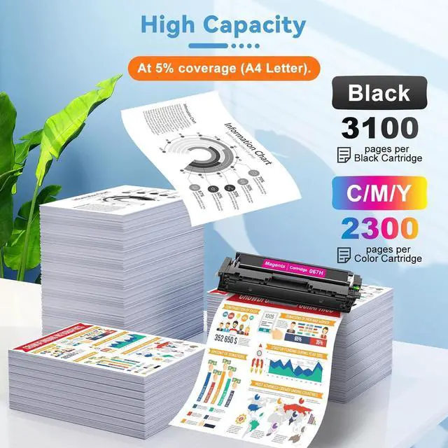 Black cartridge yields up to 3100 pages; color cartridges (cyan, magenta, yellow) yield up to 2300 pages each at 5% coverage