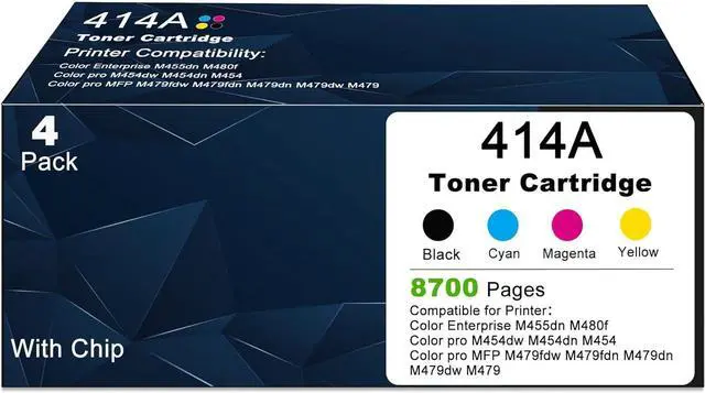 Package Contents: Includes 4-pack 414A toner cartridges 1 × Black (W2020A), 1 × Cyan (W2021A), 1 × Magenta (W2023A), and 1 × Yellow (W2022A). Each cartridge is tested for reliability and performance, ensuring a clean, easy installation and consistent results page after page.