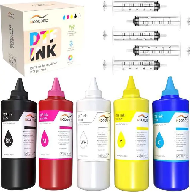 Package Includes: 17 oz (500ml) of Cyan, Magenta, Yellow, Black and White plus 5 syringes