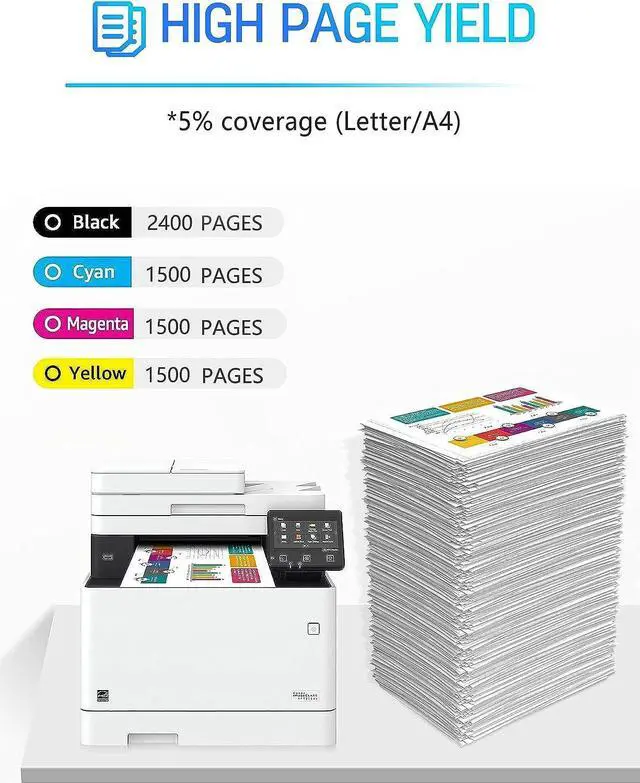 High Yield: 2400 pages per 131 black toner cartridge, 1500 pages per 131 toner cartridge color at 5% coverage on A4 Paper.