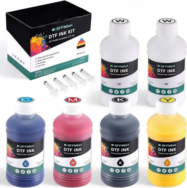 Get More for Less - Our affordable kit includes 6 bottles of DTF ink, 100ml/250ml each of Cyan, Magenta, Yellow, and Black, and 200ml/500ml of White. ICC profile available for optimal DTF ink performance.