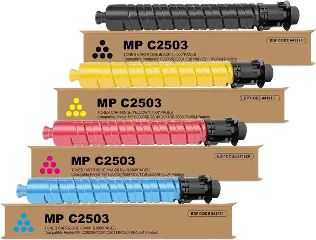 Packing List: 1x Black, 1x Cyan, 1x Magenta, 1x Yellow, 4-Pack MP C2503 / C2003 Toner Cartridges (841918 841921 841920 841919)