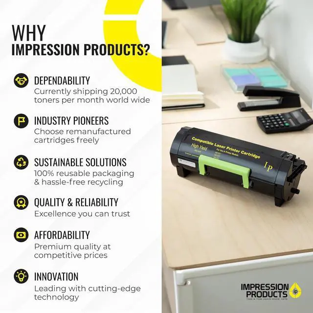 Fast, Reliable Service: Count on Impression Products for superior remanufactured toner cartridges for home and office. Were an industry-leading team with outstanding customer relationships since 1978.
