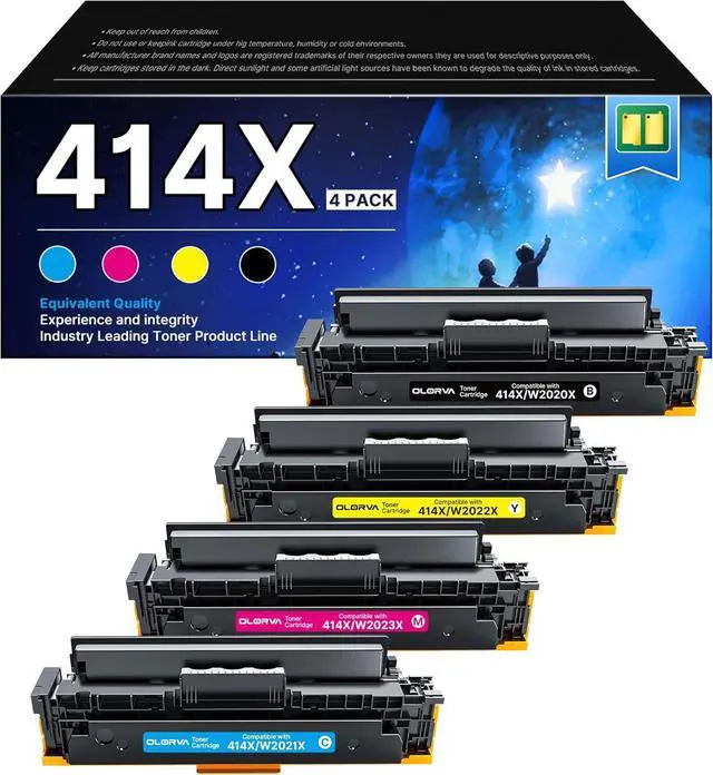 What's in the Box: 1x 414X W2020X black toner, 1x 414X W2021X cyan toner, 1x 414X W2022X yellow toner, 1x 414X W2023X magenta toner. Total 4-pack compatible replacements for hp 414x toner cartridges(all colors)
