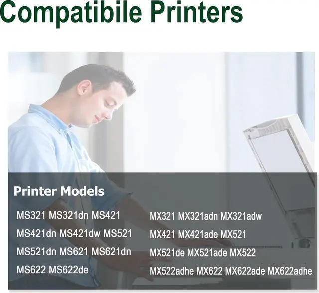 Compatible Printer:MS321 MS321dn, MS421dn, MS421dw, MS521dn, MS621dn, MS622de, MX321adn, MX321adw, MX421ade, MX521de, MX521ade, MX522adhe, MX622ade, MX622adhe printer