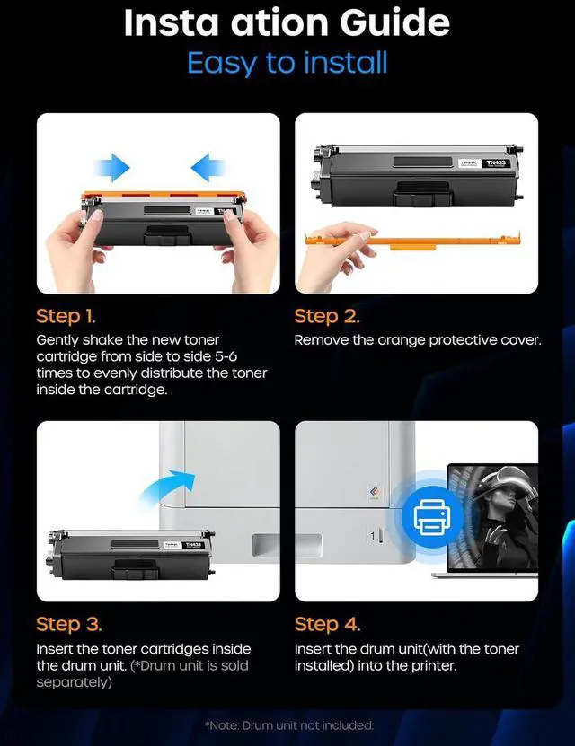Package Contents: 1 x User Guide, 1 x Black, 1 x Cyan, 1 x Magenta, 1 x Yellow (Total 4 Pack). This is for TN433/TN436 Toner Cartridge ONLY. Drum Unit is not included