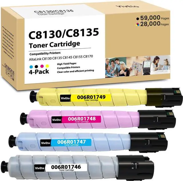 Contents: VivEto C8170 toner replacement for Xerox C8130 C8170 toner cartridge; 1 X C8130 black toner cartridge (006R01746), 1 X C8130 cyan toner cartridge (006R01747), 1 X C8130 magenta toner cartridge (006R017468), 1 X C8130 yellow toner cartridge (006R017469)