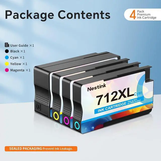Package Included: 712 ink cartridges combo pack replacement for HP 712 712XL (1 Black, 1 Cyan, 1 Magenta, 1 Yellow).