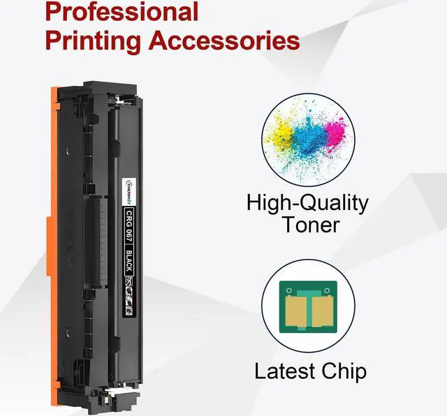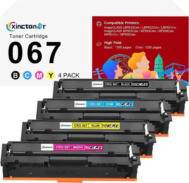 Package Contains: 067 Toner Cartridge Set Include 1 x 067 Black toner cartridge, 1 x 067 Cyan toner cartridge, 1 x 067 Yellow toner cartridge, 1 x 067 Magenta toner cartridge