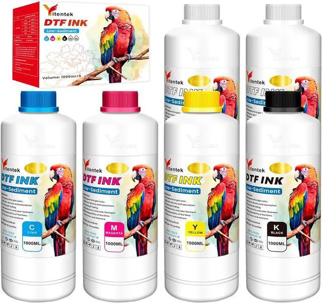 PACKAGE CONTENTS The Yitentek DTF Heat Transfer Film Printing Ink set includes 1000ml each of Cyan, Magenta, Yellow, and Black DTF inks, 2000ml of White ink, and 2 pairs of gloves. An ICC profile is also available to enhance color accuracy for your DTF printing projects.