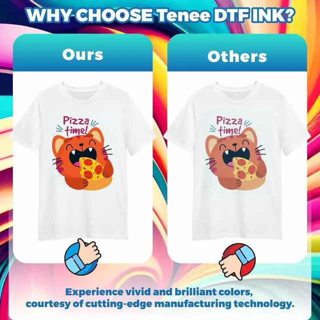 LONG-LASTING VIVIDNESS: Tenee direct-to-film transfer ink ensures that your designs remain vibrant even after washing, resisting fading over time. Not only do they endure the rigors of time, but they also maintain their shape during stretching. Entrust your creations to our ink with confidence, and you will undoubtedly enjoy a beautiful experience.