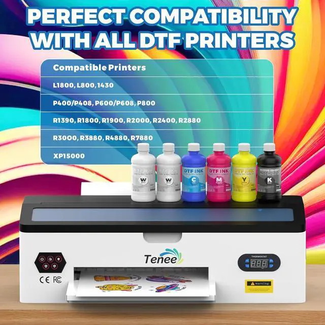 COMPATIBILITY: Our DTF inks are suitable for a variety of DTF printers, including popular models such as ET-8550,XP-15000, L1800, L805, R1390, R2400, etc.,better when used with Tenee DTF printer.