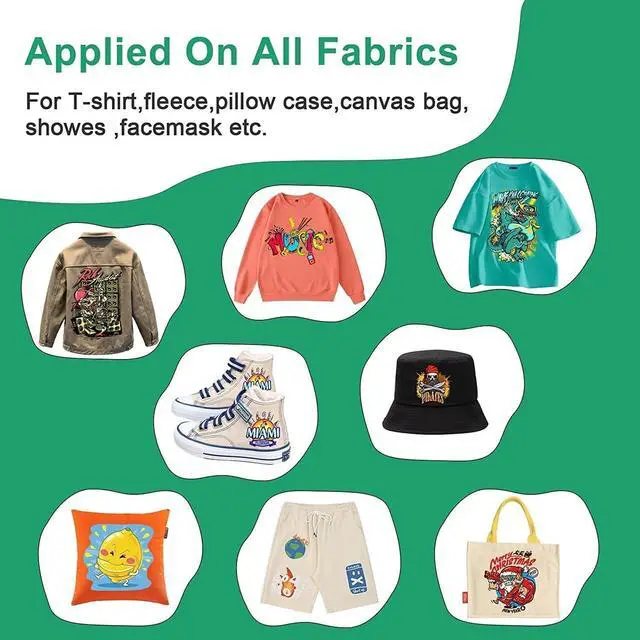 • NO FADE & HIGH QUALITYThe premium DTF DTG Heat Transfer Ink has a smooth texture and anti-clogging properties. It also has the characteristics of high saturation, good permeability, quick drying, waterproof and colorfastness.