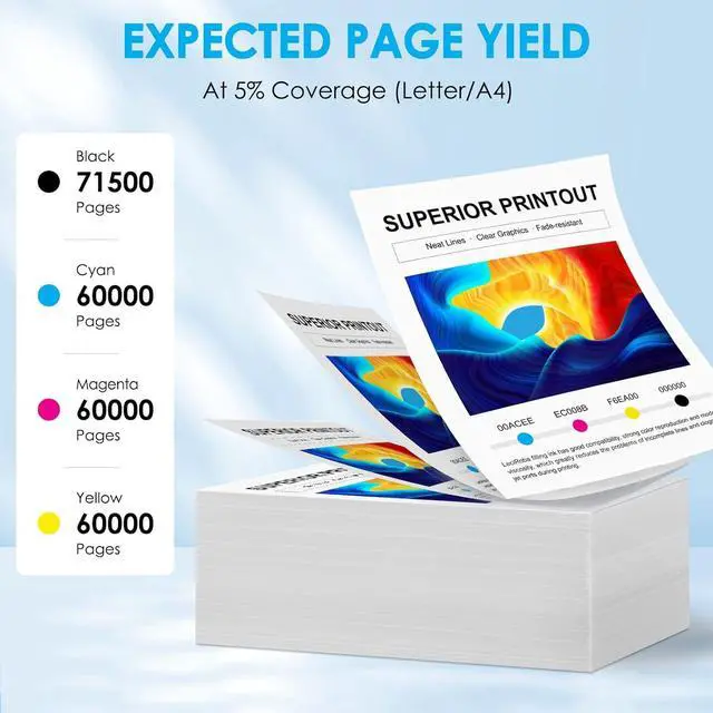 High Page Yield: 71,500 pages per Black, 60,000 pages per Cyan Magenta Yellow, at 5 percent Coverage of A4 letter.