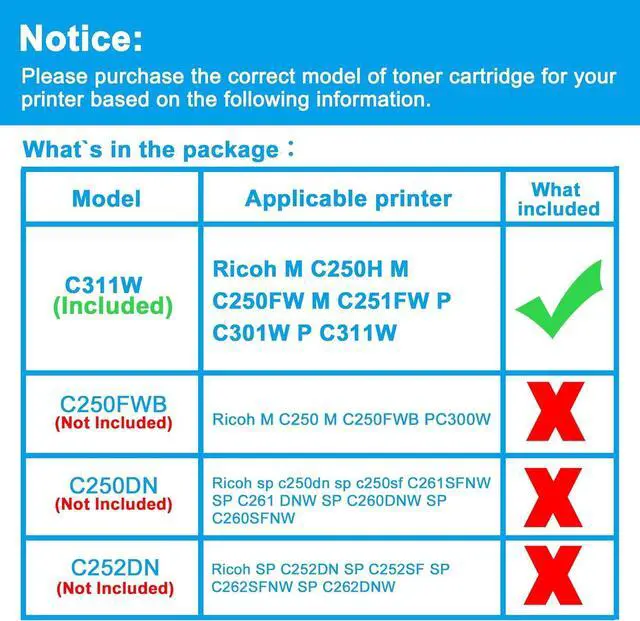 Compatible Printers: Replacement for Ricoh M C250H M C250FW M C251FW P C301W P C311W