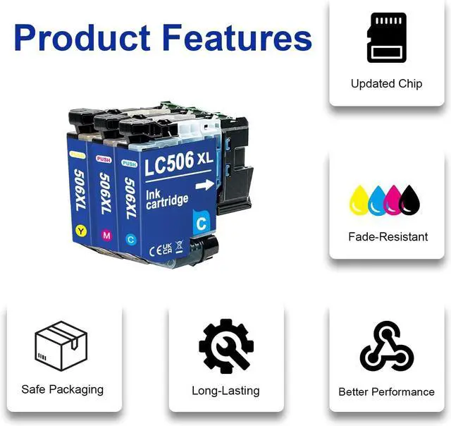 PACKAGE CONTENTS 1×LC506XL Cyan Ink Cartridge, 1×LC506XL Magenta Ink Cartridge, 1×LC506XL Yellow Ink Cartridge
