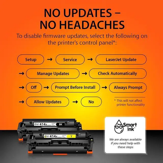 Before Installation: Please turn off firmware updates on your printer control panel to ensure uninterrupted printing with your Smart Ink replacement for HP414X toner cartridges 4 pack