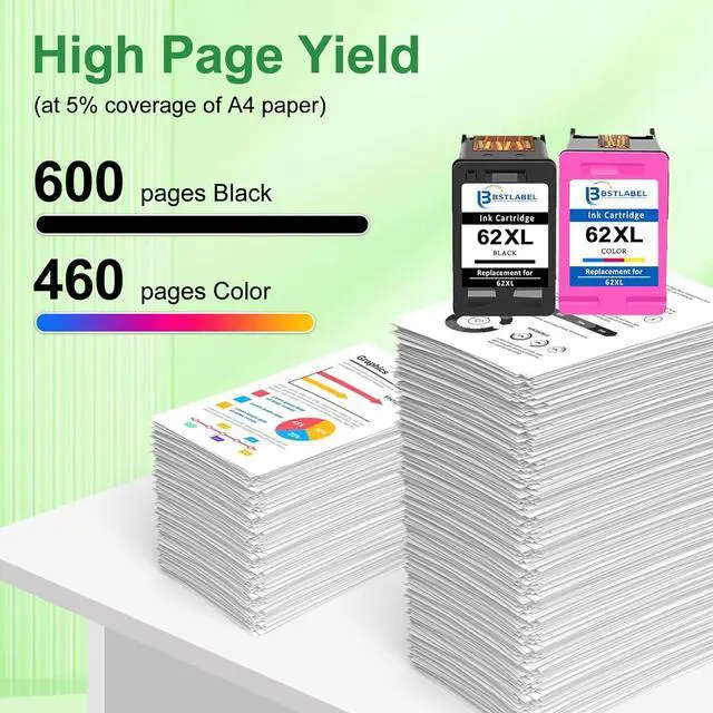 High Yield : BSTLABEL 62XL Ink Cartridge Replacement for HP 62 Ink Cartridge Combo Pack Which Page Yield Is Up to 600 pages per for hp 62 black ink cartridge , 450 pages per for hp ink 62 color at 5% coverage (A4 paper size).
