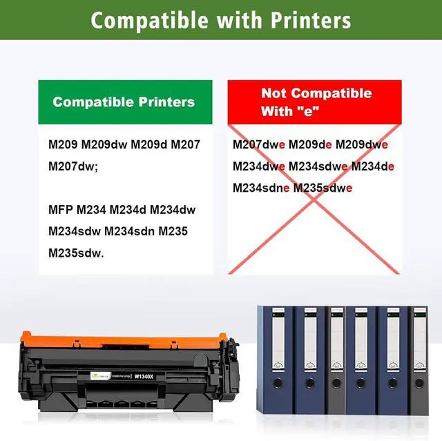 WARNING Compatibility Alert: Our compatible toner cartridge cannot be used with H P+ printers whose model names end with "e." These printers are designed to operate exclusively with genuine H P cartridges. Our compatible toner cartridge is only compatible with non-H P+ printers that do not have an "e" in the model name.