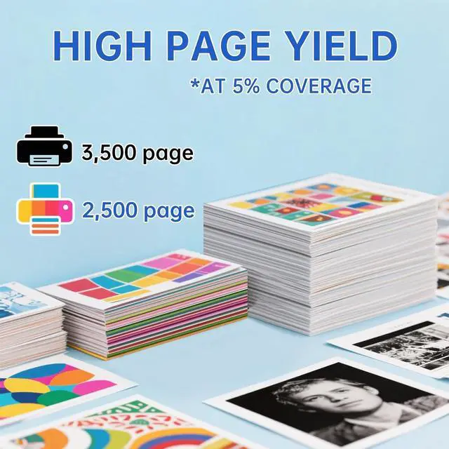 Page Yield: Up to 3,500 pages per black toner cartridge and up to 2,500 pages per color cartridge (Cyan, Magenta, Yellow) at 5% coverage on letter/A4 paper. For best results, use with letter or A4 size paper only.