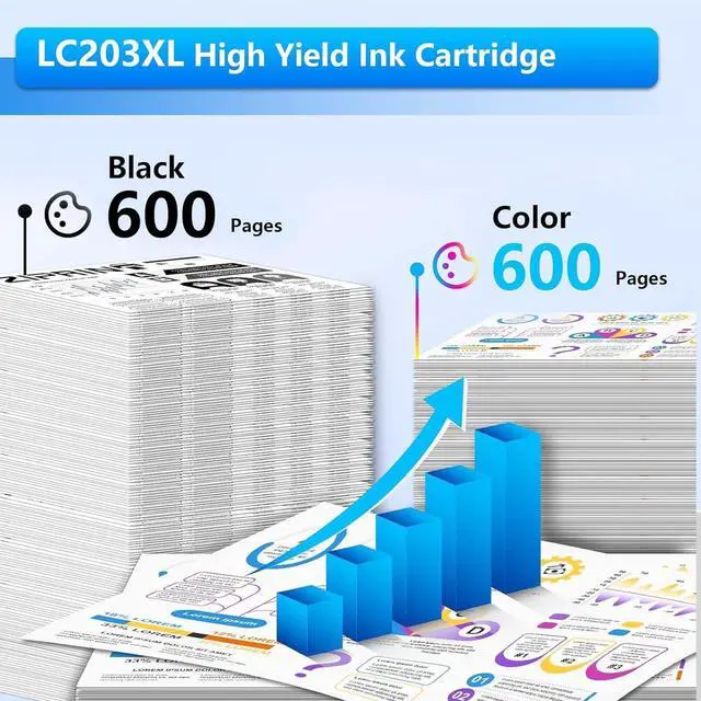 High Yield & Outstanding Savings: Enjoy massive page outputup to 600 pages per LC203 XL Black ink cartridge, up to 600 pages per LC203CL C/M/Y ink cartridges (5% coverage)