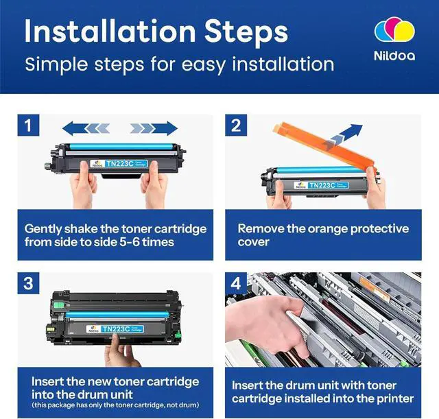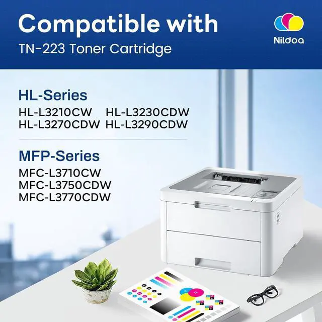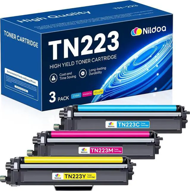 Package Contents: Nildoa TN223 TN-223 Toner Cartridge Replacement for Brother TN223 TN223C TN223M TN223Y Toner Cartridge High Yield 3 Pack(1Cyan/1Magenta/1Yellow)