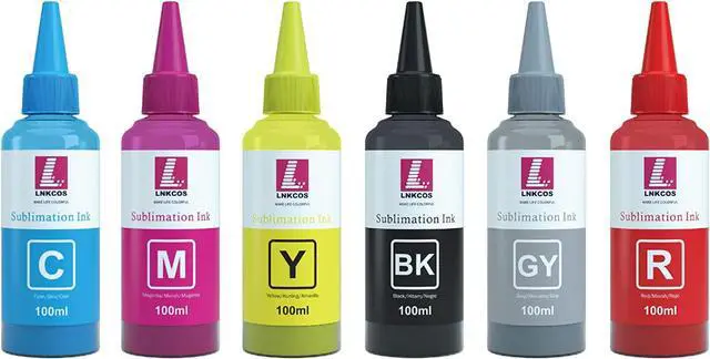 Package Includes: 100ML Black Sublimation Ink, 100ML Gray Sublimation Ink, 100ML Cyan Sublimation Ink, 100ML Magenta Sublimation Ink, 100ML Yellow Sublimation Ink, 100ML Red Sublimation Ink, Total 600ML, 6 Syringes, 6 needles