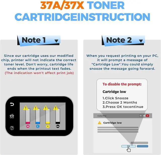 Excellent Performance: The CF237A 37A Toner Cartridge for HP37A adapts the latest upgraded chip, ensuring high compatibility for printers. It also avoids common printing problems such as streaks, smudges, and leaking. The CF237A 37X Toner Cartridge delivers vivid and clear printing and produces sharp text and vibrant images, ensuring consistent, high-performance output.