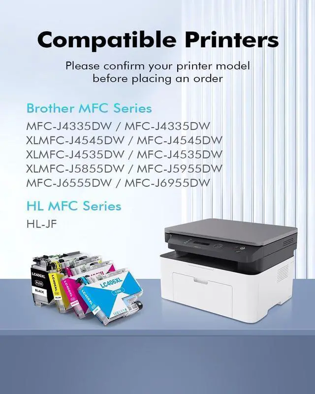 Compatible Printers:LC406 Ink cartridges for Brother LC406XL Compatible for Brother MFC-J4335DW, MFC-J4335DW XL, MFC-J4345DW, MFC-J4345DW XL, MFC-J4535DW, MFC-J4535DW XL, MFC-J5855DW, MFC-J6555DW, MFC-J6955DW, MFC-J5955DW, HL-JF1 Printer