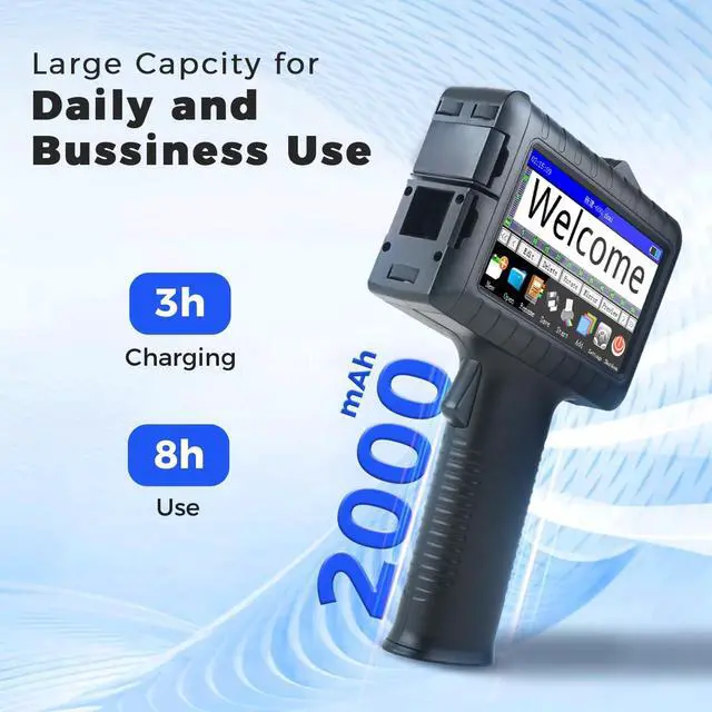 Reliable All-Day Performance. Powered by a built-in 2000mAh rechargeable battery, this device offers up to 8 hours of continuous operation. Use a U disk to upload external fonts, logos, and images, with support for multiple file formats such as TXT, CSV, JPG, PNG, and BMP.
