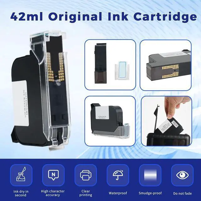 42ml Black Ink Cartridge. This cartridge ensures extended printing with quick-drying, waterproof ink that produces sharp, smudge-free impressions. Each cartridge can print approximately 100,000 characters. To prevent clogging, remove and cap the cartridge if it will not be used for more than 10 minutes.