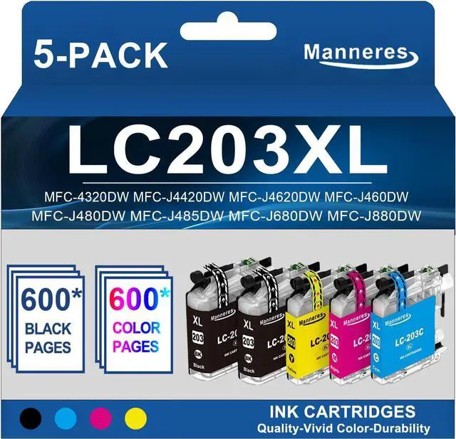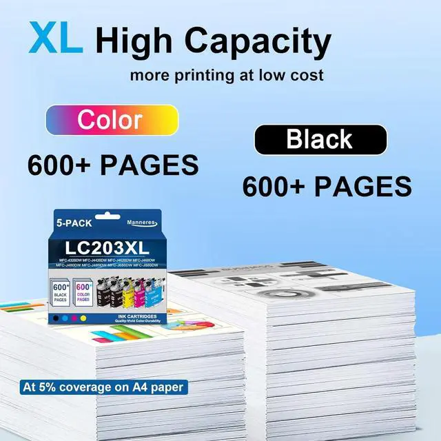 High Page Count - Low Cost: Each LC203XL ink cartridges can output at least 600 pages, allowing you to achieve print quality at a low cost.These 5 packages offer a total of 3,000 pages, making them ideal for use in homes, offices and schools (Letter/A4, 5% coverage)