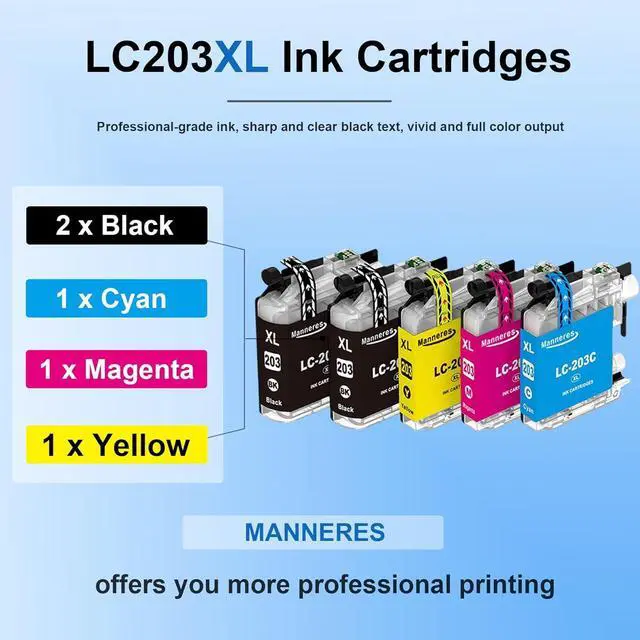 Complete 5-Pack Set - Full Color Printing: Your all-in-one solution for vibrant printing.This value pack includes:one each of High-Yield Cyan, Magenta and Yellow LC203XL ink cartridges, 2* Black LC203XL ink cartridges.Ensuring you're ready for any printing task