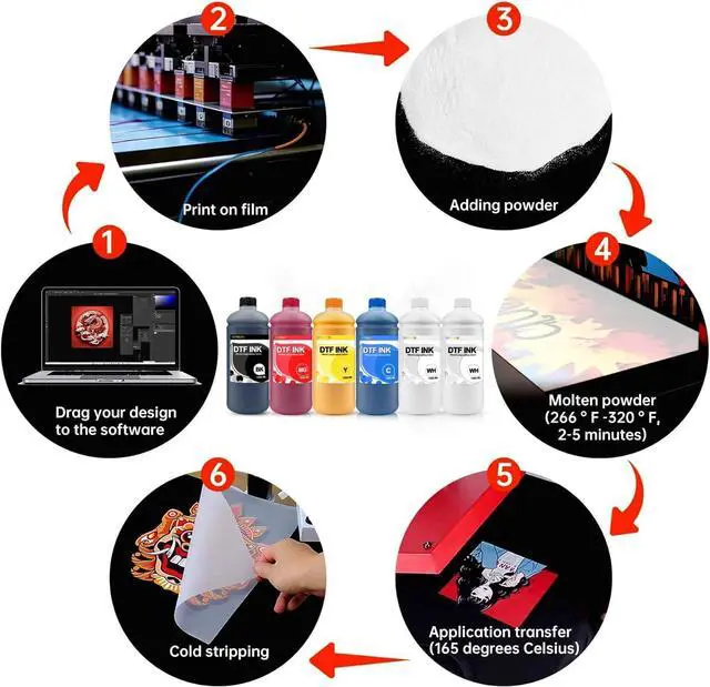 DTF INK Vibrant Long-Lasting Colors:Includes 2 White,1 Black,1 Cyan,1 Magenta,and 1 Yellow ink bottles (6000ML total),delivering sharp and vivid prints for all your designs